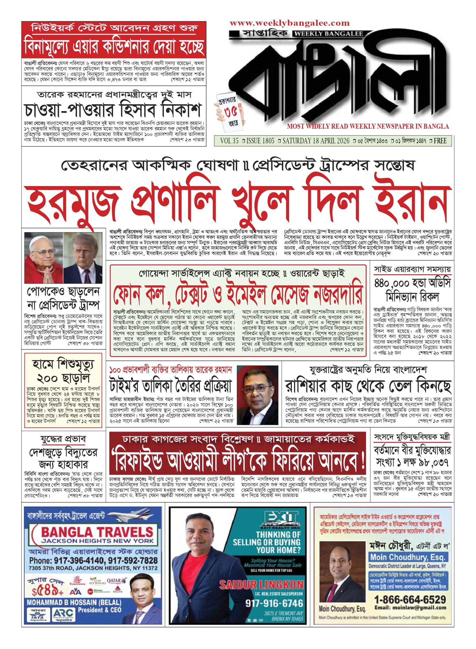 নিউইয়র্কঃ মহান স্বাধীনতা ও জাতীয় দিবস উপলক্ষে জাতিসংঘে বাংলাদেশ স্থায়ী মিশন ও বাংলাদেশ কনস্যুলেট জেনারেল, নিউইয়র্ক—এর যৌথ উদ্যোগে গত ১০ এপ্রিল সন্ধ্যায় কনস্যুলেট জেনারেল প্রাঙ্গণে অভ্যর্থনার আয়োজন করা হয়। উক্ত অনুষ্ঠানে যুক্তরাষ্ট্রে বসবাসরত বীর মুক্তিযোদ্ধা, বিভিন্ন রাজনৈতিক, সামাজিক, সাংস্কৃতিক, গণমাধ্যম ব্যক্তিত্ব এবং প্রবাসী বাংলাদেশী কমিউনিটির বিশিষ্ট সদস্যবৃন্দের উপস্থিতি তাৎপর্যমন্ডিত করে। বাংলাদেশ ও যুক্তরাষ্ট্রের জাতীয় সঙ্গীত পরিবেশনের মাধ্যমে অনুষ্ঠান শুরু হয়। পরে স্বাধীনতা সংগ্রামের ইতিহাসভিত্তিক একটি প্রামাণ্যচিত্র প্রদর্শিত হয়।